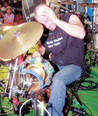 Percussion aficionados caught whiff: "People have heard about me and take pictures of me and stuff. I better make a CD before someone copies my gimmick and starts doing it better than I can." But with hand bandaged and swollen like a prizefighter, he says that no one sticks with it for too long because of the pain.